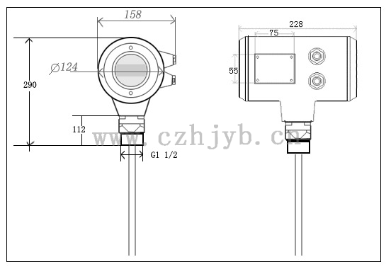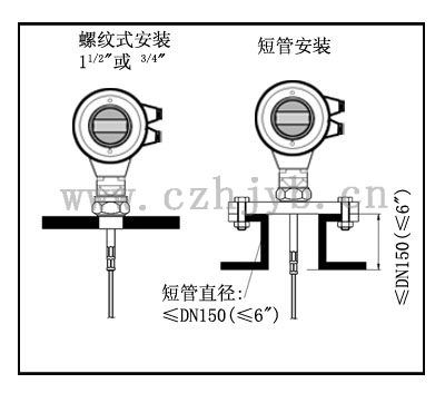 儀表可采用螺紋連接,螺紋的長度不要超過150mm,還可以采用在短管上安裝。理想的短管直徑小于150mm,高度小于150mm,若安裝于較長的短管上,應底部固定纜繩或選用對中支架以避免纜繩與短管末端接觸。