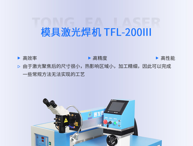 通發(fā)激光國內(nèi)率先推廣國產(chǎn)模具激光焊機,TFL-200Ⅲ升級型世界500強選用,針對精密塑膠模具激光焊、鏡面塑膠模具激光燒焊、精密壓鑄模具激光焊補.為國內(nèi)模具修復行業(yè)做出巨大貢獻。