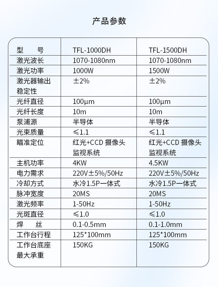 采用光纖激光器,反射率高,能量強,免維護,免調(diào)光,功耗少,相比傳統(tǒng) 模具焊來說,體積小,安全,穩(wěn)定性好超長使用壽命。 1000W光纖激光器,滿足銅、鋁焊接量大的模具及產(chǎn)品焊接加工需要。 高承重底座及工作臺,保持輕便靈活的優(yōu)點,同時提供更高承載能力。 配備.1.5P大功率一體式水冷水機,保證了大功率焊接的穩(wěn)定性。